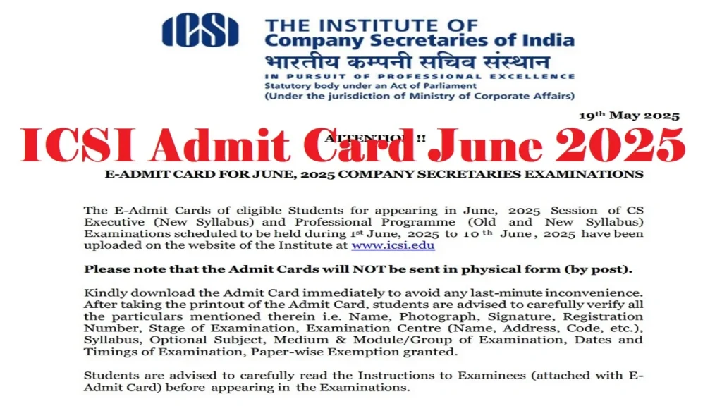 यह e-Admit Card आधिकारिक वेबसाइट icsi.edu पर 19 मई 2025 को जारी किया गया है। छात्र अब अपने Login Credentials की मदद से इसे डाउनलोड कर सकते हैं और परीक्षा की तैयारियों को अंतिम रूप दे सकते हैं।